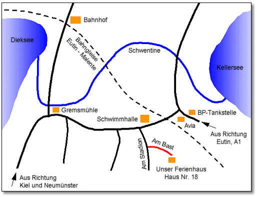 In Bad Malente angekommen, folgen Sie der Skizze bis zu unserem Ferienhaus. Falls Sie Probleme bei der Anreise haben sollten, können Sie uns